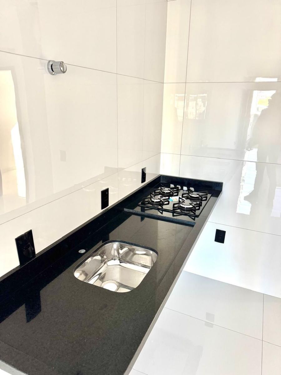 - Sala e cozinha no conceito aberto, permitindo livre circulação entre os ambientes, garagem para dois veículos, lavanderia coberta com tanque, Esquadrias em alumínio preto fosco, Janelas com vidros, pias em mármore branco, janelas com vidros reflexivos, esquadrais em alumínio preto, banheiro com nicho, luminárias interna em led, fogão Cookop, calhas em preto na parte frontal e fundos, porta principal com puxadores em inox preto fosco, fechaduras istam em preto fosco nas portas internas, jardim frontal, luminárias em led nos muros.