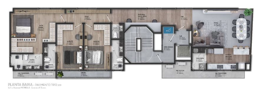 Com uma área total e privativa de 296.39m², este imóvel no 3º andar é um verdadeiro refúgio urbano. Seus 3 dormitórios, todos suítes, foram cuidadosamente projetados para proporcionar o máximo de conforto e privacidade. Os 4 banheiros, elegantemente decorados, complementam o requinte deste lar.